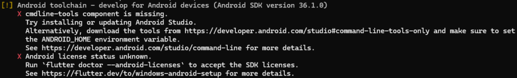 The Android cmdline-tools component is missing Flutter error appears when running flutter doctor and indicates that the Android SDK Command Line Tools are not properly installed or configured. If you see this error during Flutter setup, it means your Android toolchain is incomplete and Flutter cannot locate the required SDK utilities.